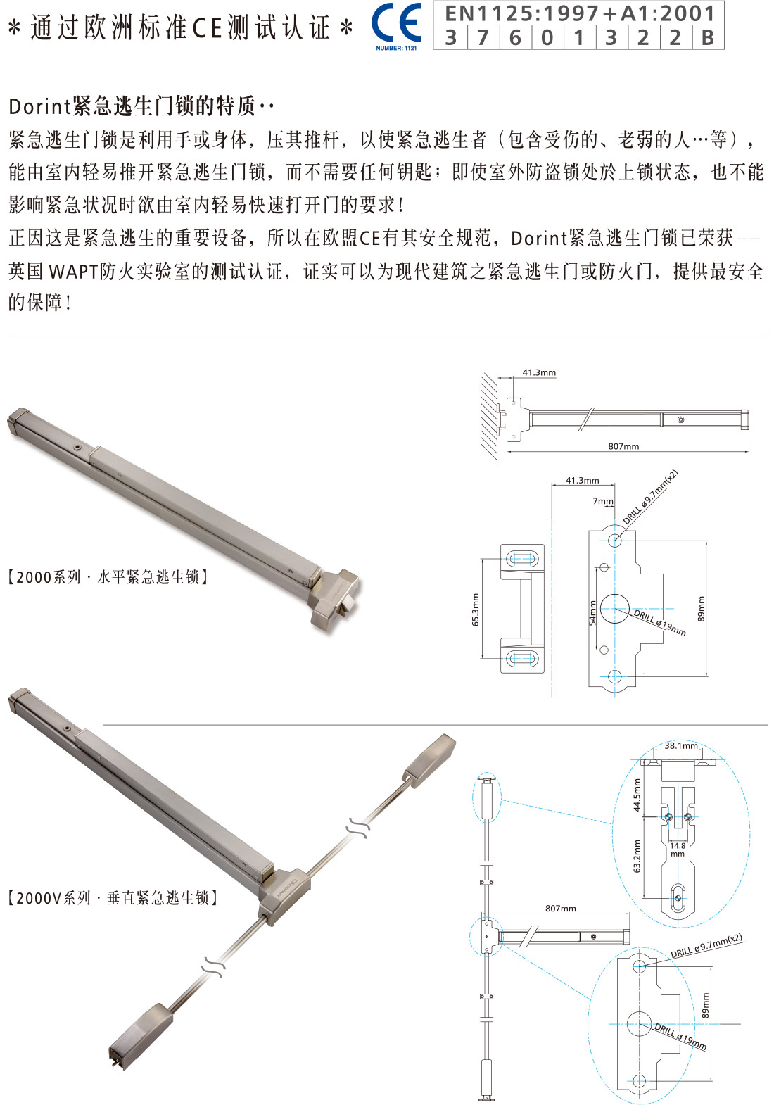 正因这是紧急逃生的重要设备,所以在欧盟CE有其安全规范, Dorint紧急逃生门锁已荣获 英国WAPT防火实验室的测试认证,证实可以为现代建筑之紧急逃生门或防火门,提供最安全 的保障!