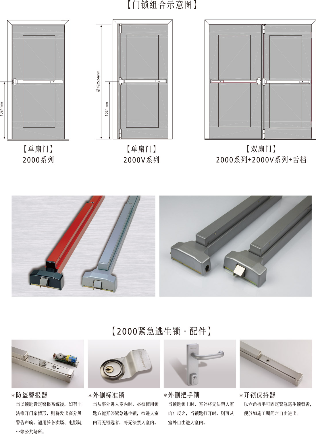 Dorint紧急逃生门锁的特质 紧急逃生门锁是利用手或身体,压其推杆,以使紧急逃生者(包含受伤的、老弱的人…等能由室内轻易推开紧急逃生门锁,而不需要任何钥匙;即使室外防盗锁处於上锁状态,也不能影响紧急状况时欲由室内轻易快速打开门的要求!