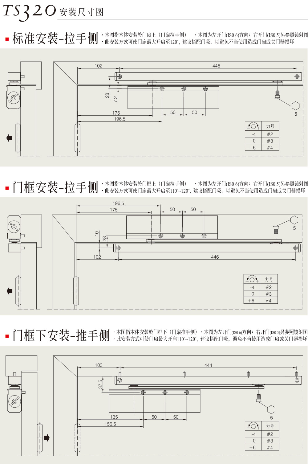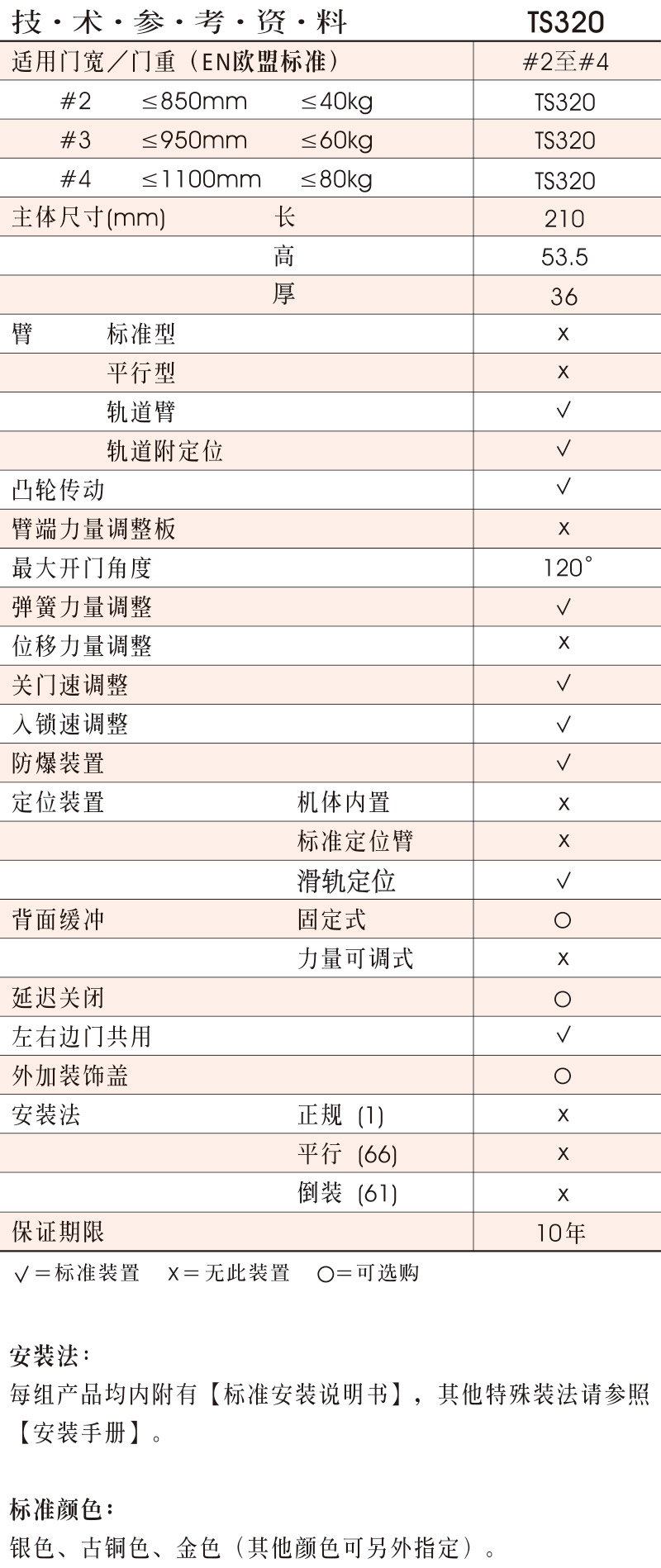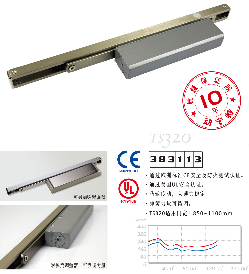 • 通过欧洲标准CE安全及防火测试认证 • 通过美国UL安全认证 • 凸轮传动,入锁力稳定 • 弹簧力量可微调 • TS320适用门宽:850~1100mm