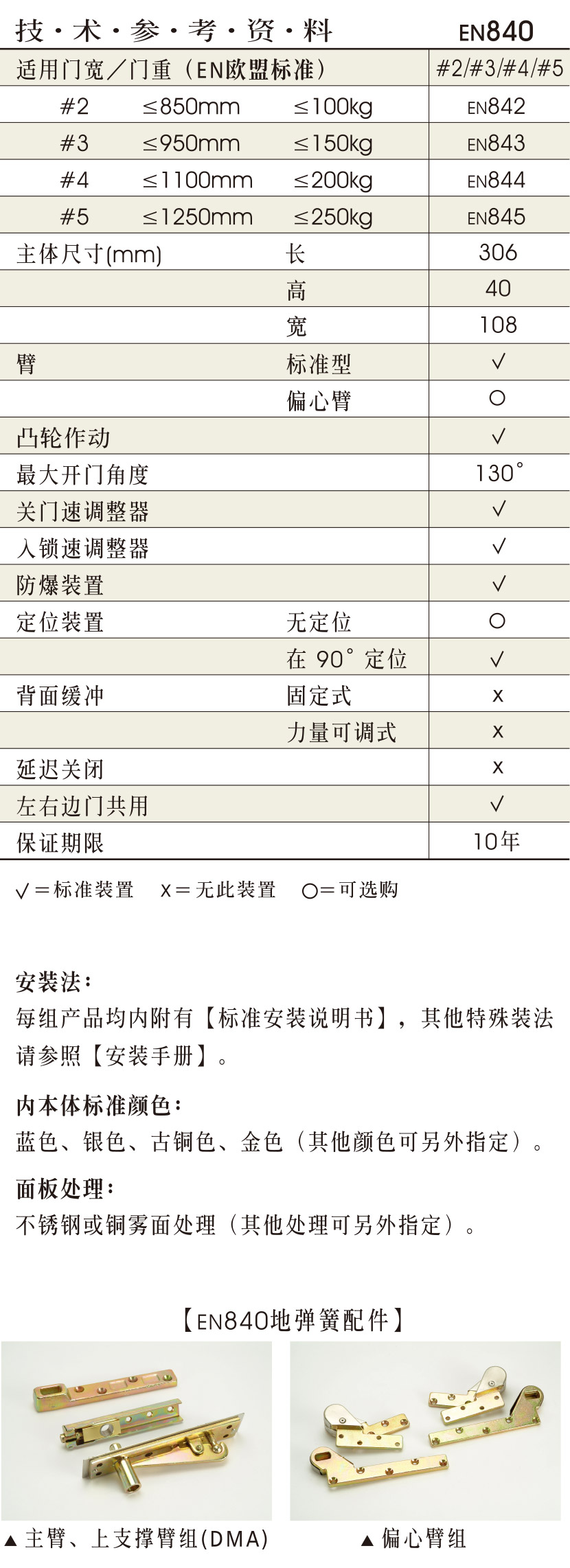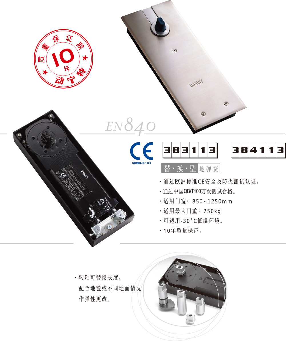 • 通过欧洲标准CE安全及防火测试认证 • 通过中国QB//T100万次测试合格 • 适用门宽:850~1250mm • 适用最大门重:250kg • 10年质量保证
