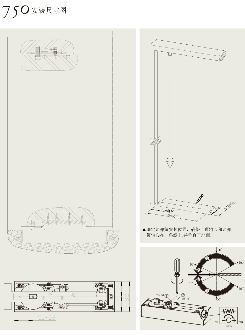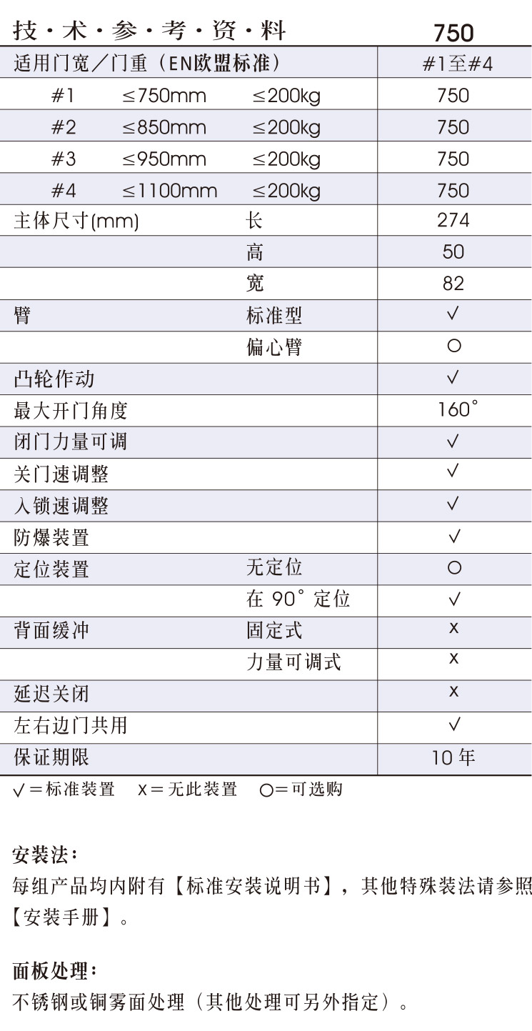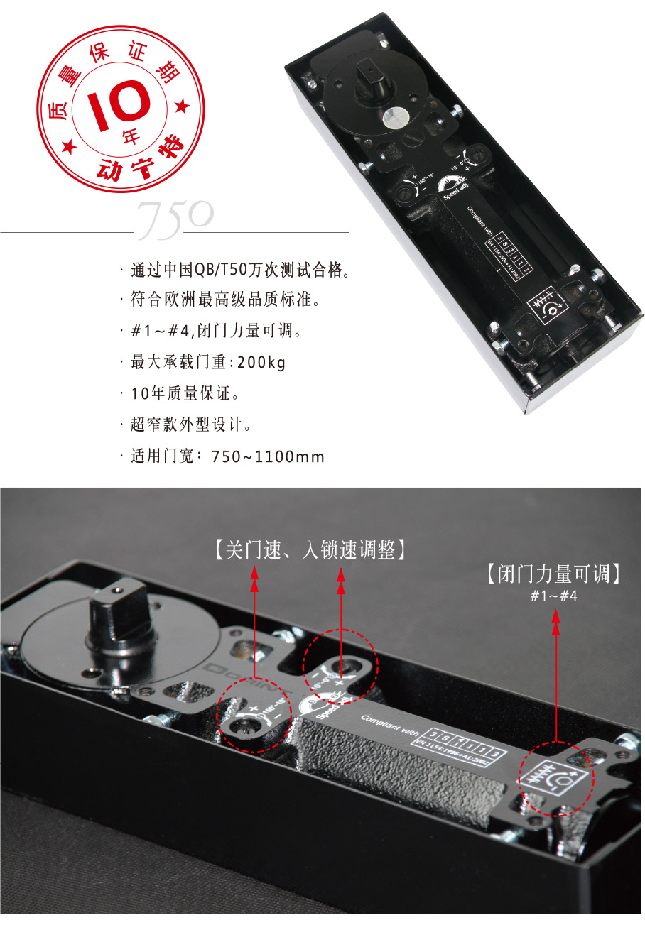 • 通过中国QB//T50万次测试合格 • 符合欧洲最高级品质标准 • #1~#4,闭门力量可调 • 最大承载门重:200kg • 10年质量保证 • 超窄款外形设计 • 适用门宽:750~1100mm