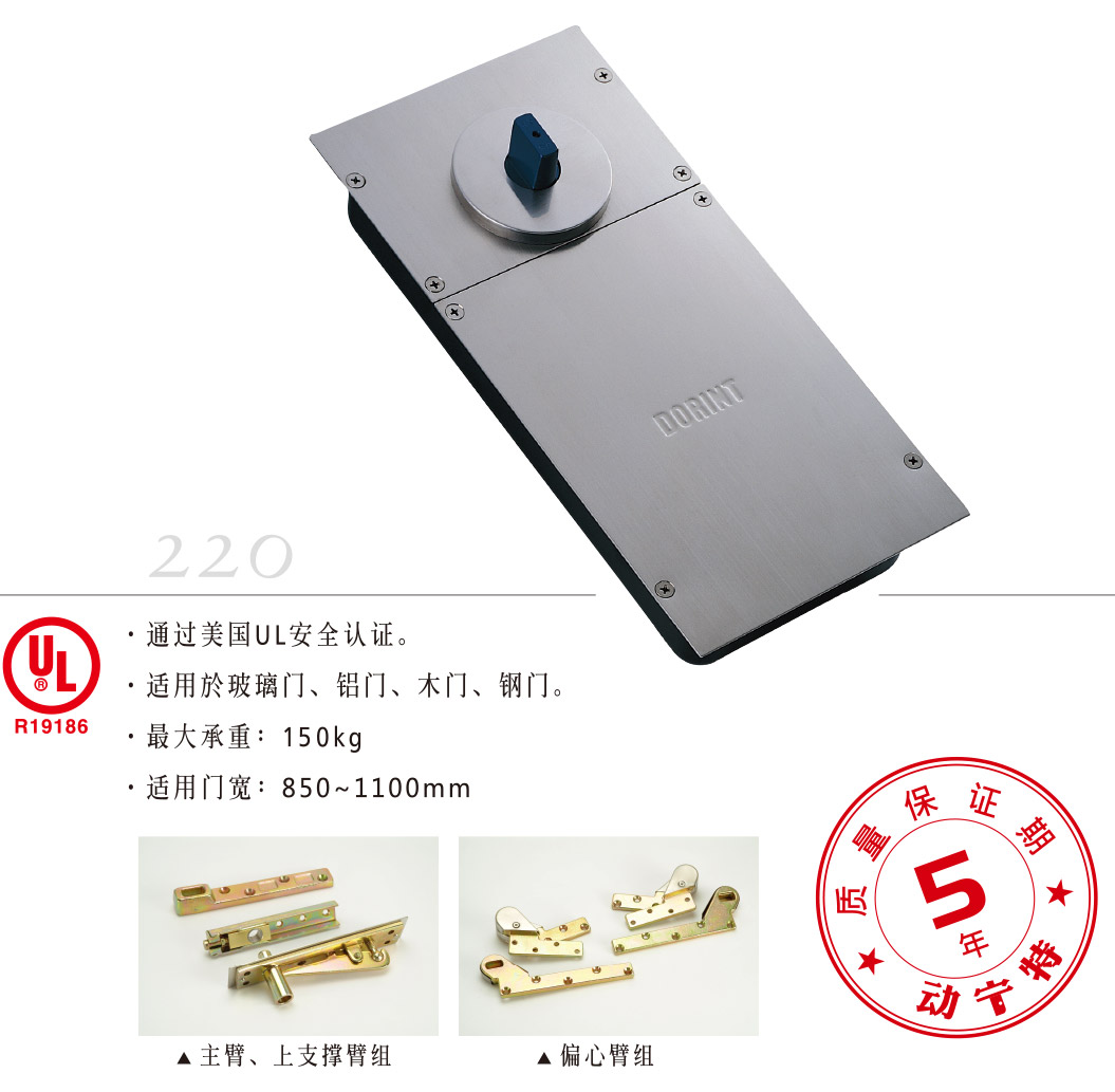 • 通过美国UL安全认证 • 适用于玻璃门、铝门、木门、钢门 • 最大承重:150kg • 适用门宽:850~1100mm
