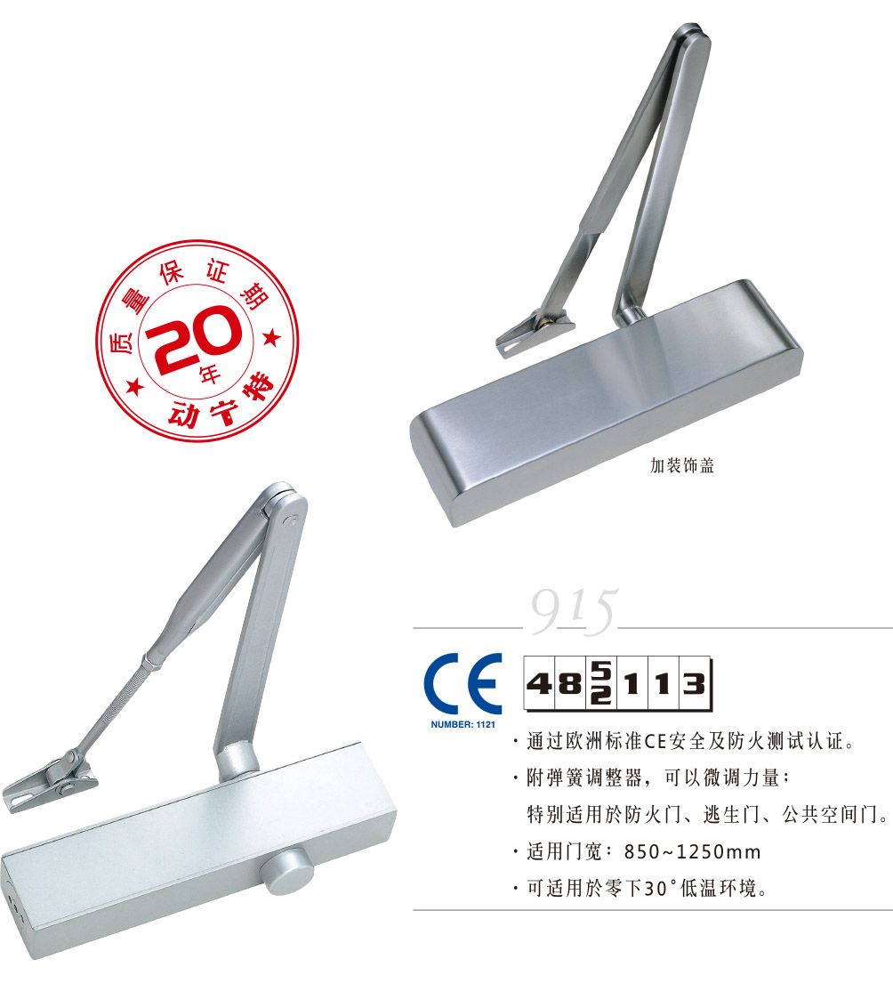 • 通过欧洲标准CE安全及防火测试认证 • 附弹簧调整器,可微调力量;特别适用于防火门、逃生门、公共空间门 • 适用门宽:850~1250mm • 可适用于零下30°低温环境