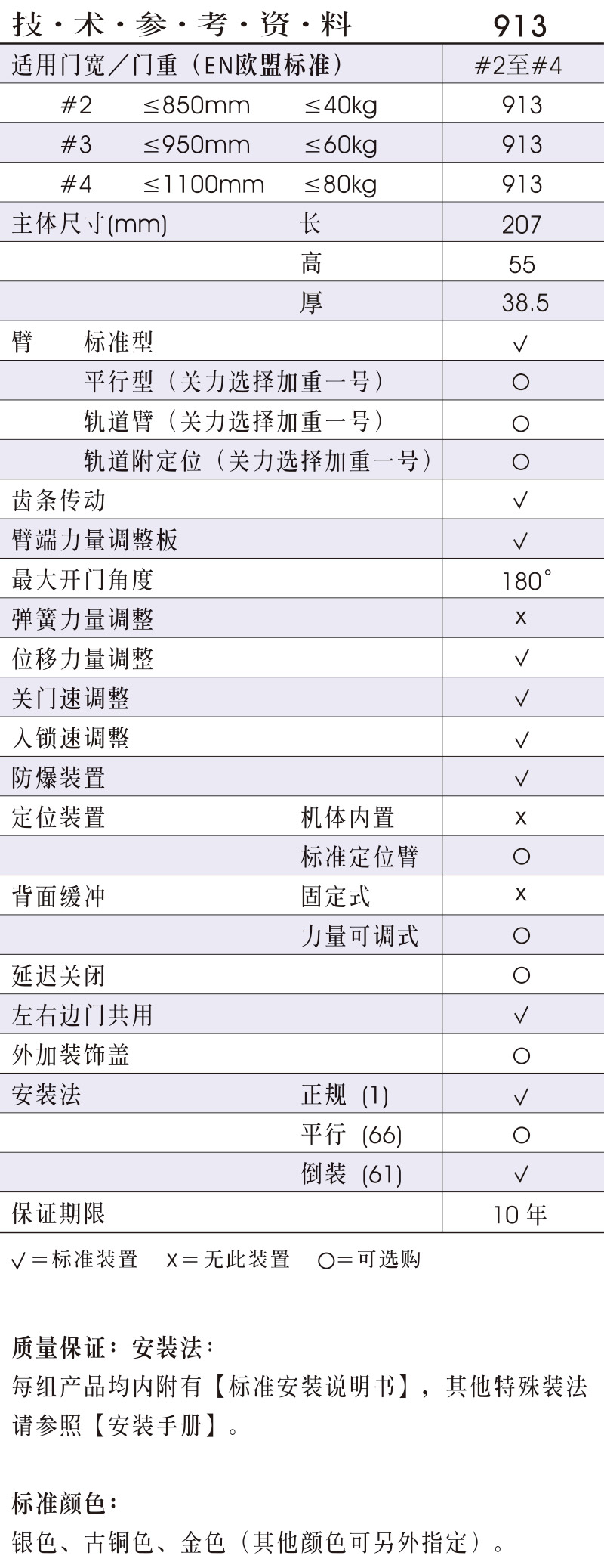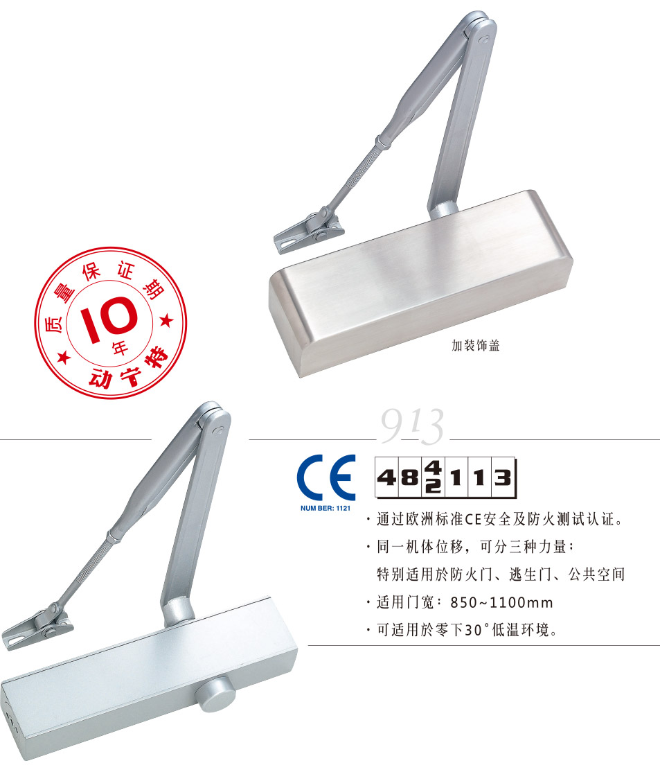 • 通过欧洲标准CE安全及防火测试认证 • 同一机体位移,可分三种力量;特别适用于防火门、逃生门、公共空间门 • 适用门宽:850~1100mm • 可适用于零下30°低温环境
