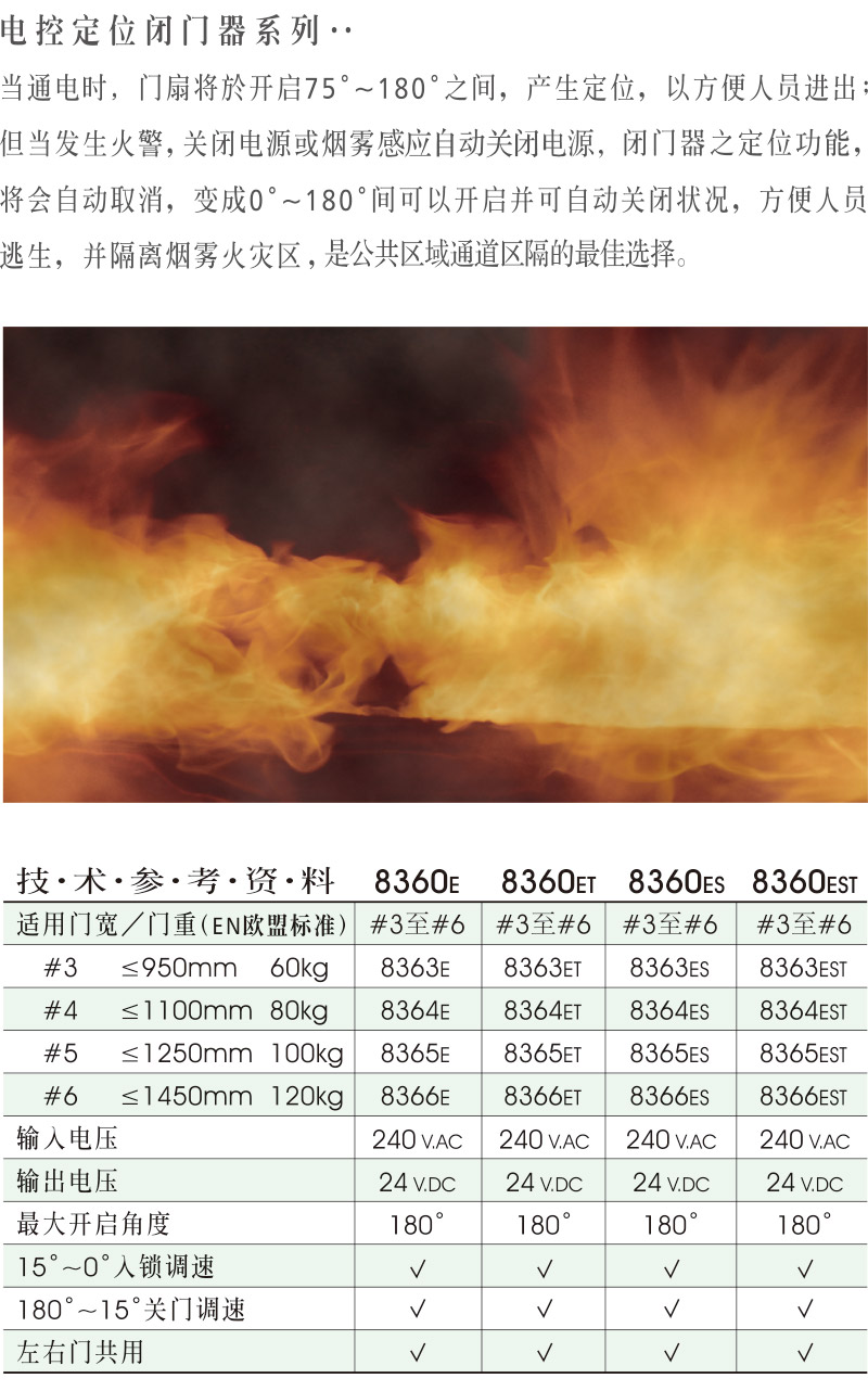 当通电时,门扇将于开启 75°~180°之间,产生定位,以方便人员进出;但当发生火警,关闭电源或烟雾感应自动关闭电源,闭门器之定位功能,将会自动取消,变成 0°~180°间可以开启并可自动关闭状况,方便人员逃生,并隔离烟雾火灾区,是公共区域通道区隔的最佳选择。