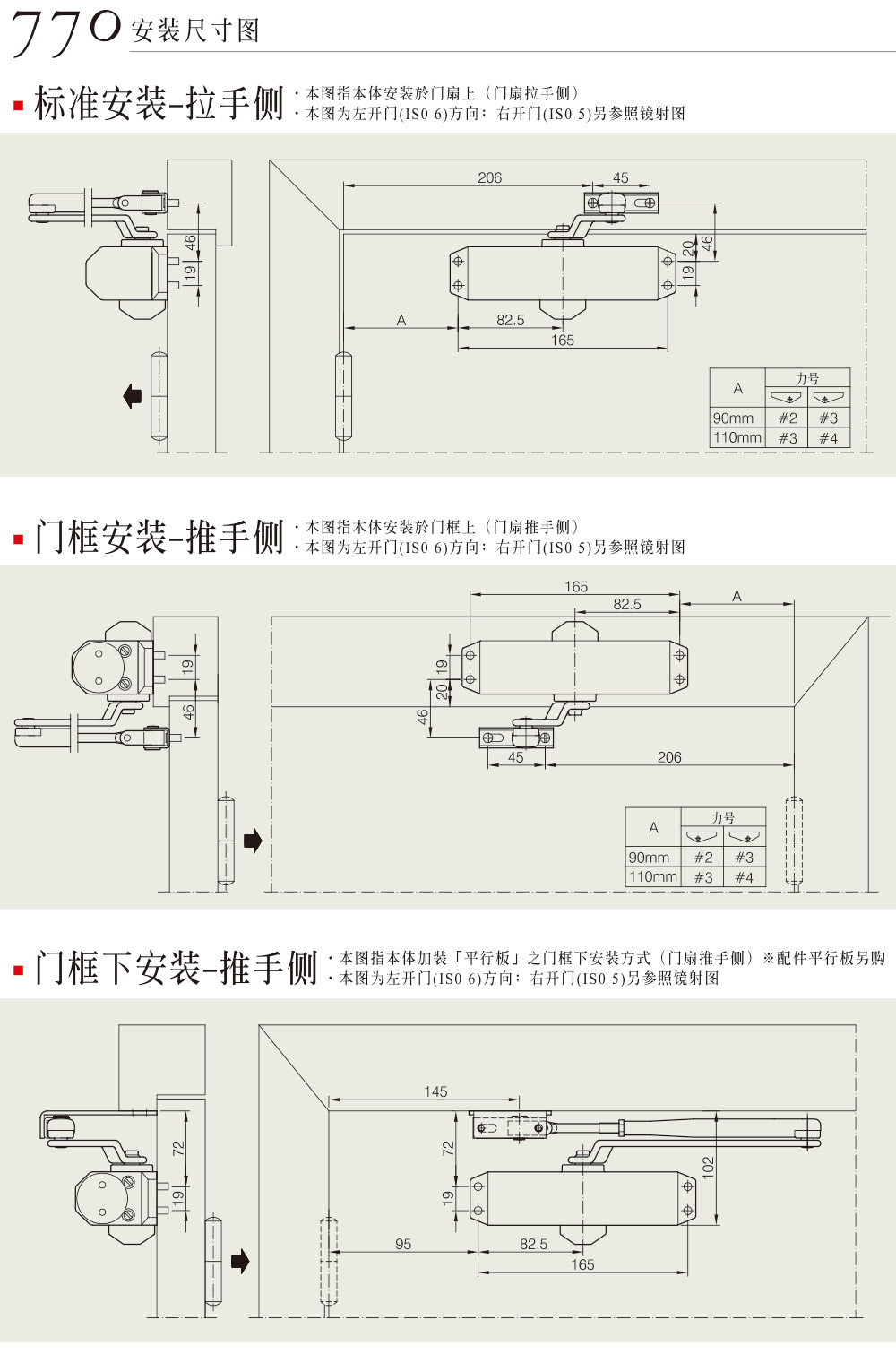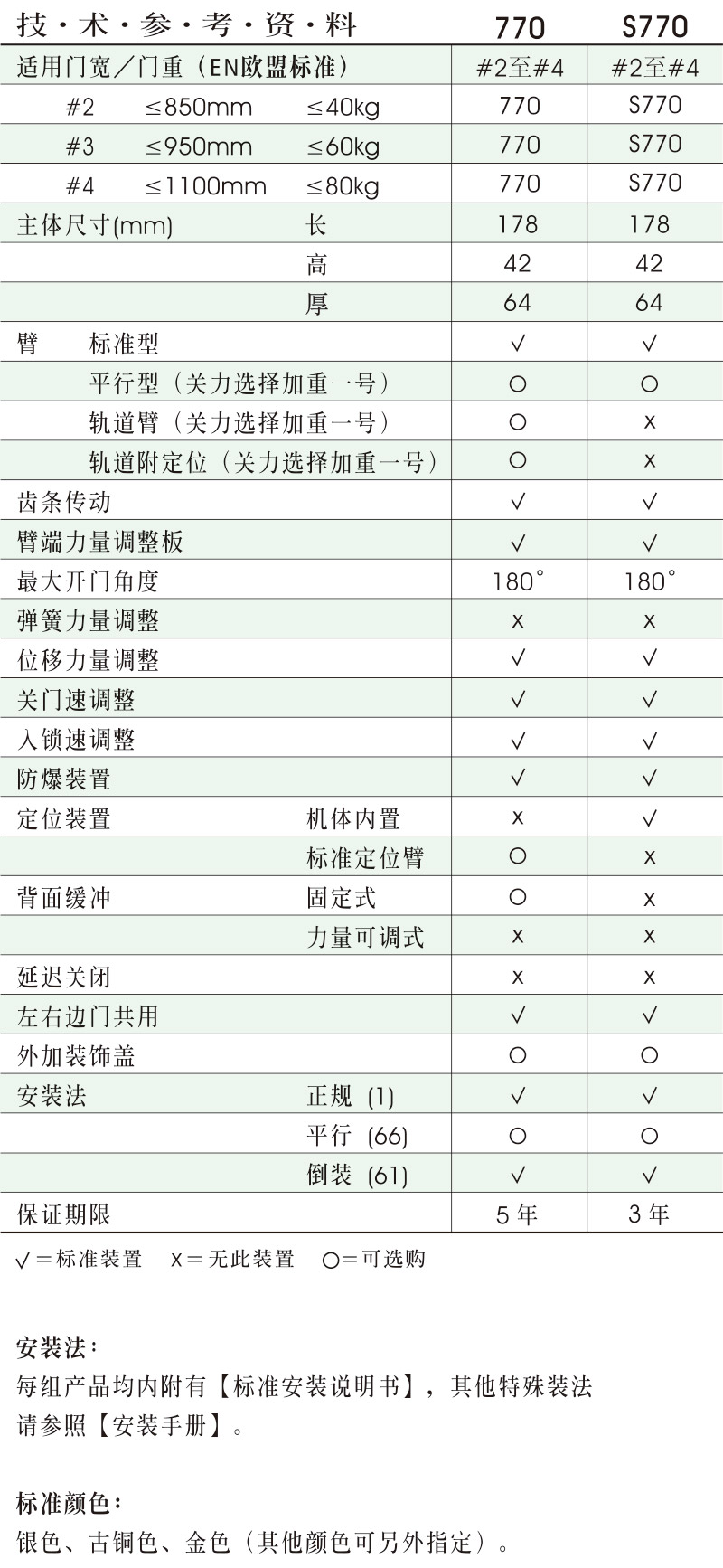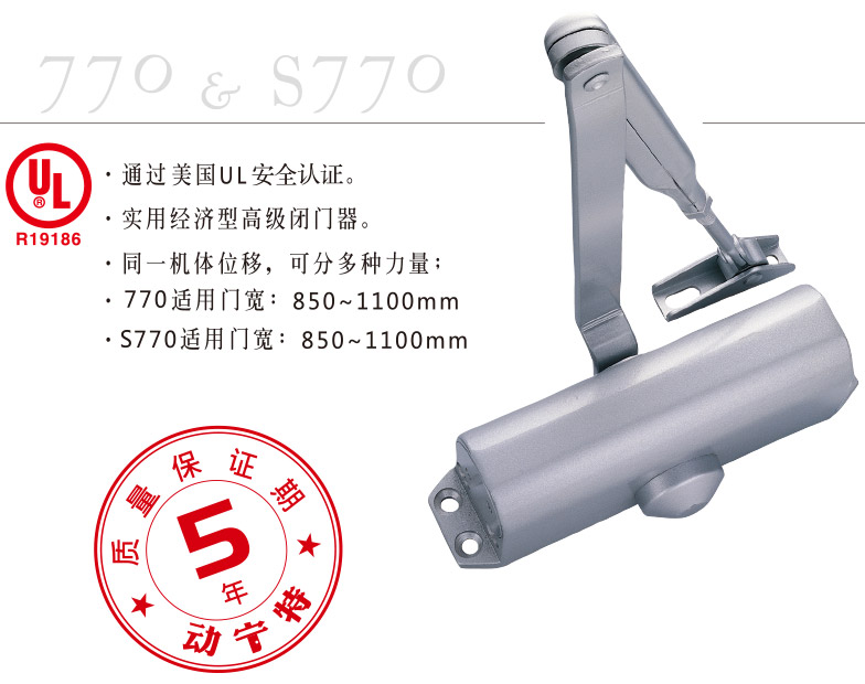 • 通过美国UL安全认证 • 实用经济型高级闭门器 • 同一机体位移,可分多种力量 • 770适用门宽:850~1100mm • S770适用门宽:850~1100mm