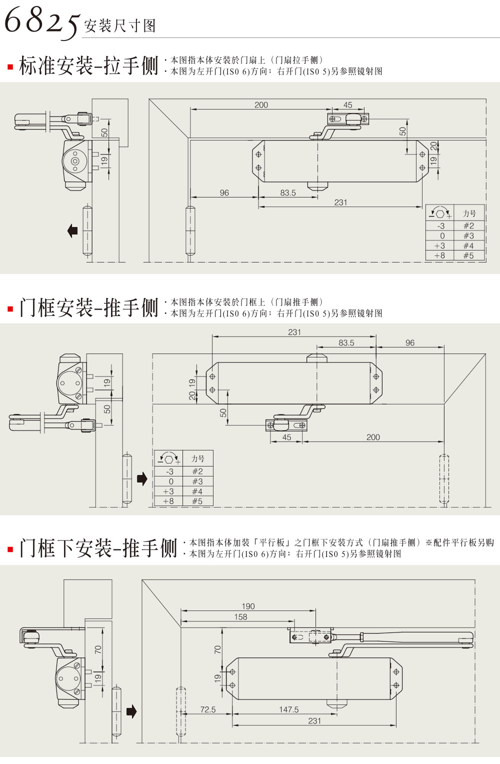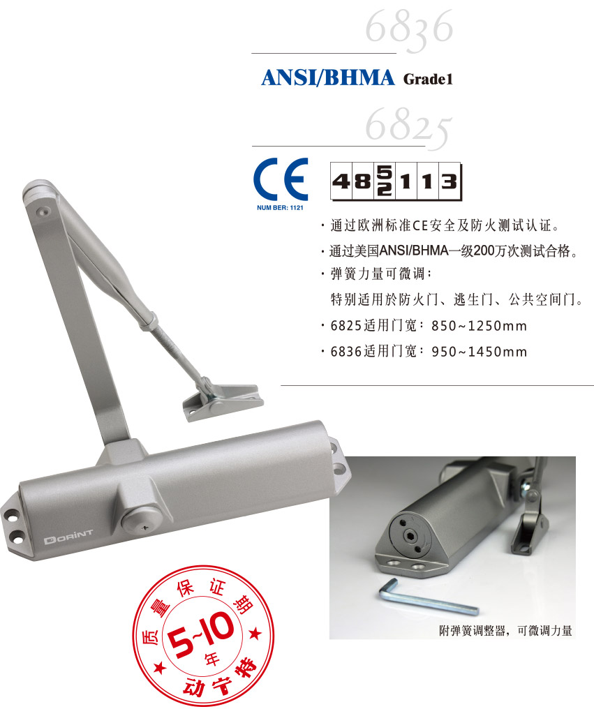 • 通过欧洲标准CE安全及防火测试认证 • 通过美国ANSI/BHMA一级200万次测试合格 • 弹簧力量可微调;特别适用于防火门、逃生门、公共空间门 • 6825适用门宽:850~1250mm • 6836适用门宽:950~1450mm