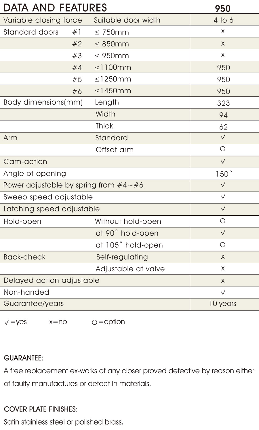 Power adjustable by springs from #4 ~ #6 Narrow design Suitable door width 1.10m-1.45m Suitable door width max. 300kg 10 years guaranteed