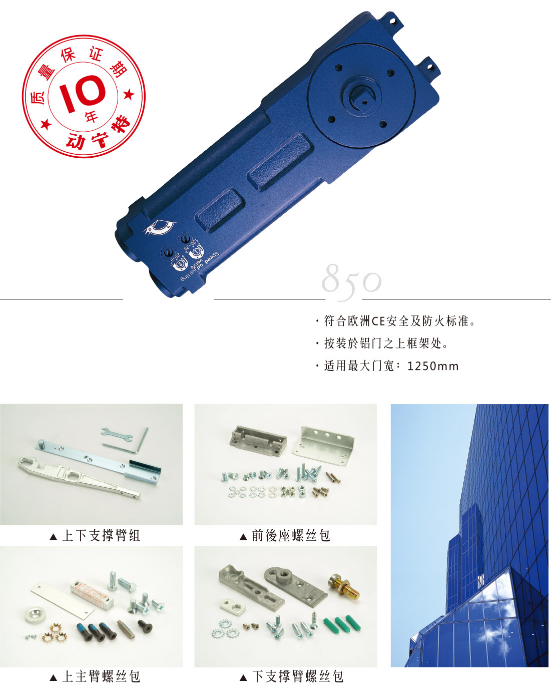 • 符合欧洲CE安全及防火标准 • 安装于铝门之上框架处 • 适用最大门宽:1250mm