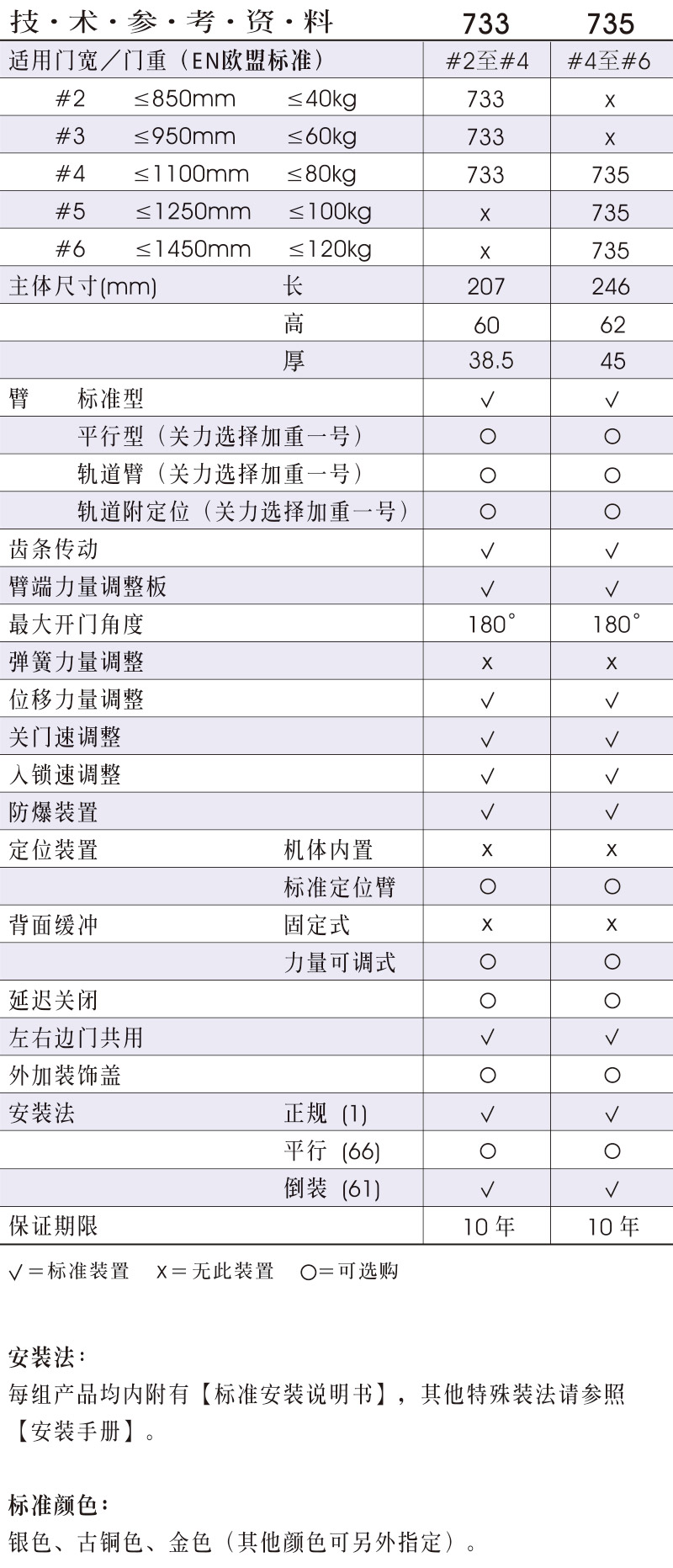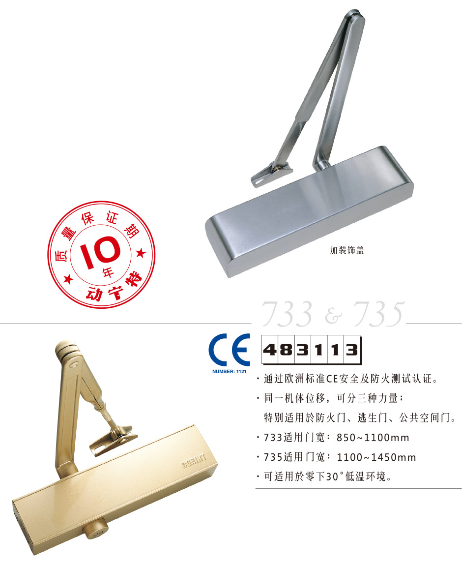 • 通过欧洲标准CE安全及防火测试认证 • 同一机体位移,可分三种力量;特别适用于防火门、逃生门、公共空间门 • 733适用门宽:850~11000mm • 735适用门宽:1100~1450mm • 可适应于零下30°低温环境