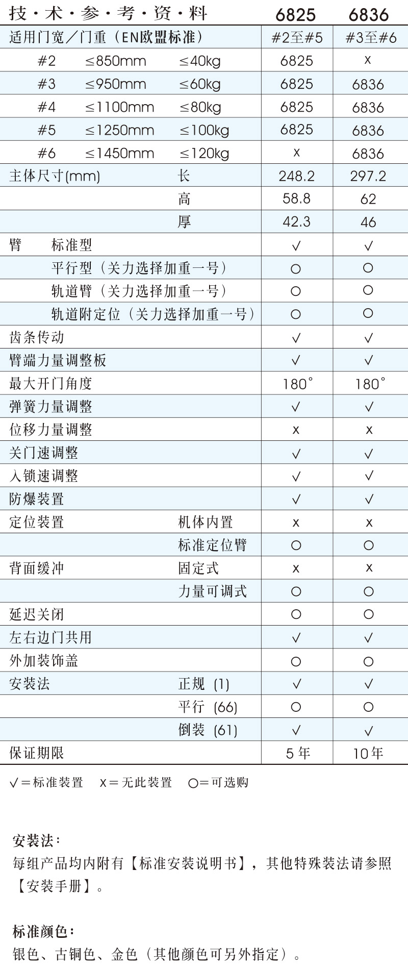 • 通过欧洲标准CE安全及防火测试认证 • 通过美国ANSI/BHMA一级200万次测试合格 • 弹簧力量可微调;特别适用于防火门、逃生门、公共空间门 • 6825适用门宽:850~1250mm • 6836适用门宽:950~1450mm